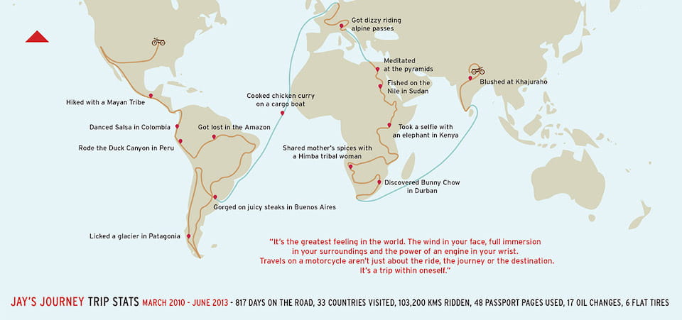 Jammin thru the Global South is the name of Jay’s journey that saw him ride sanDRina, his Suzuki DR650 motorcycle from Chicago to New Delhi overland through the Americas, Europe, Africa and into India from March 2010 till June 2013 with breaks along the way, including an extended one in Kenya.